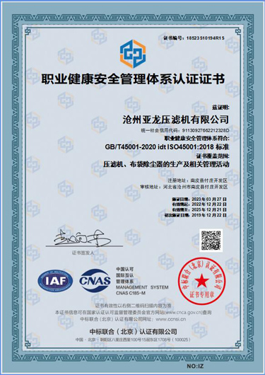 職業(yè)健康安全管理體系認證證書-滄州亞龍壓濾機有限公司