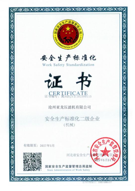 安全生產(chǎn)標(biāo)準(zhǔn)化證書-滄州亞龍壓濾機(jī)有限公司